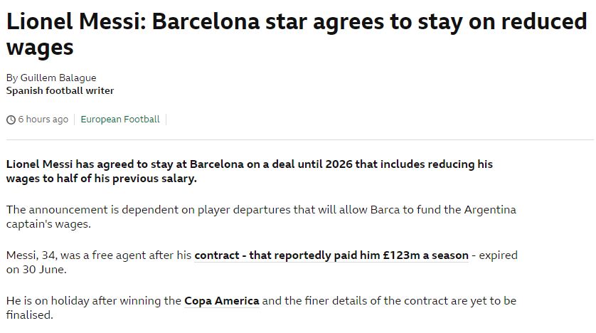 | (BBC)리오넬 메시, 급여 절반 삭감과 2026년까지 바르셀로나 잔류 합의 | |