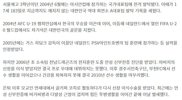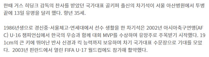 [히딩크의 찬사를 받았던 전 국대 GK 차기석, 투병생활 끝에 별세]