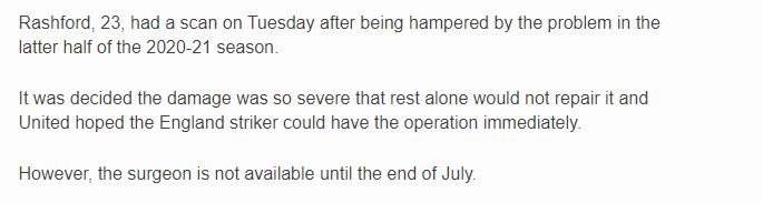 그 결과 부상이 휴식만으로는 회복할 수 없다고 판단, 맨유는 즉시 수술을 받기를 원했다.