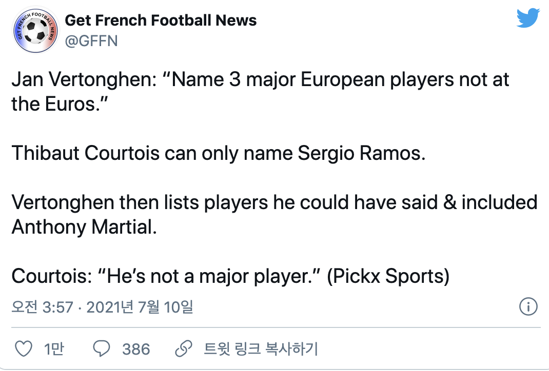 유로에 출전하지 못한 메이저 선수 3명을 말해보라는 질문을 받은 베르통언과 쿠르투아 베르통언: 유로에서 안 뛰는 톱플레이어 3명만 얘기해봐! 쿠르투아: 라모스?? 베르통언: 홀란드, 반다이크, 모이스킨, 마샬 이런 선수들도 있잖아? 쿠르투아: 마샬이 무슨 톱플레이어야 ㅋㅋㅋ