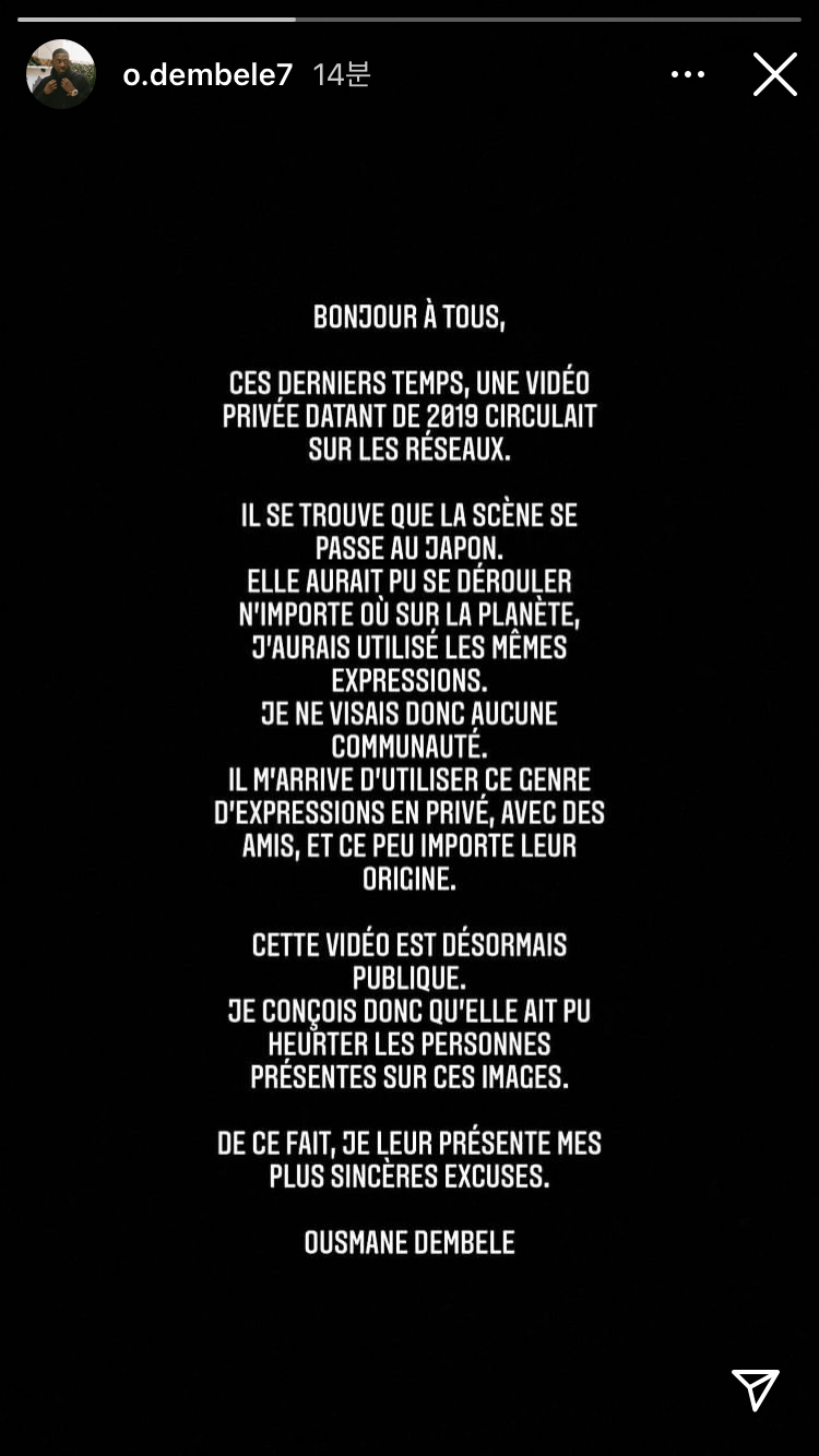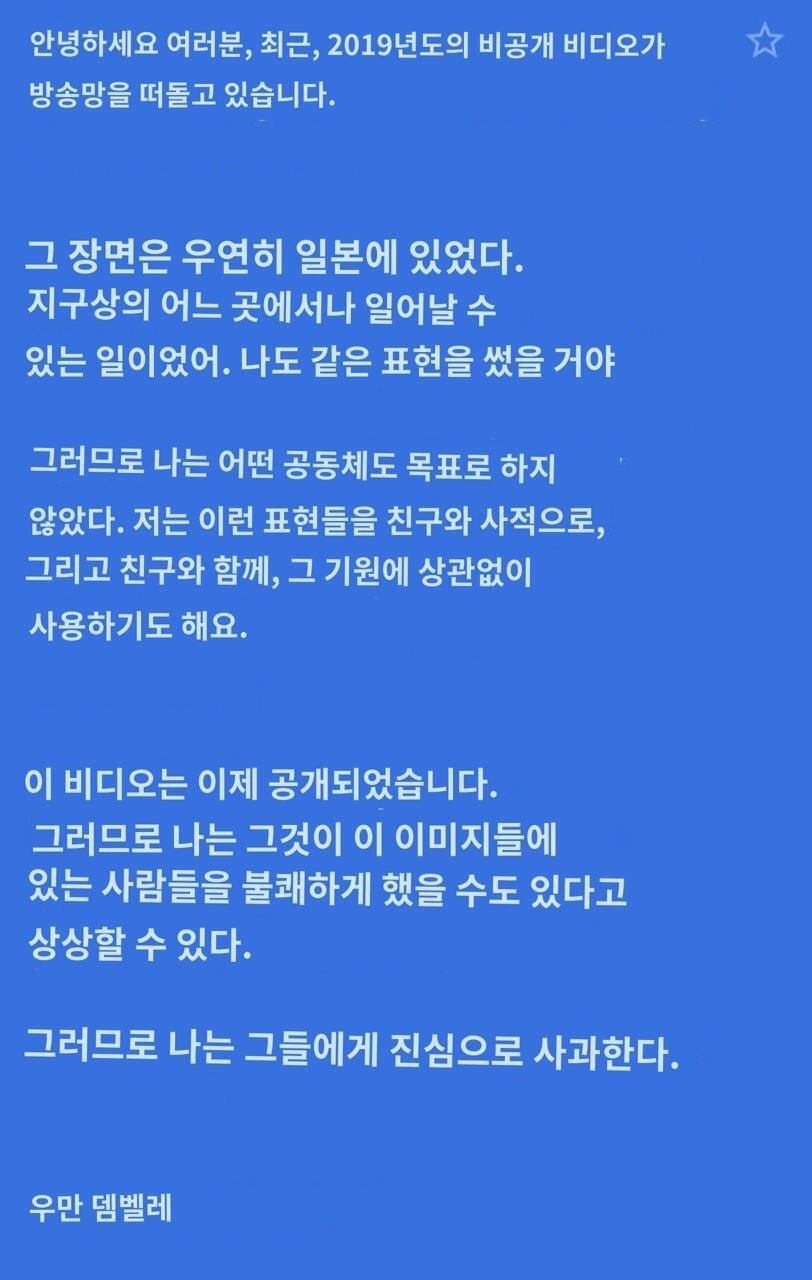 [최근 논란이 됐던 인종차별사건에 대해 사과문을 올린 뎀벨레]