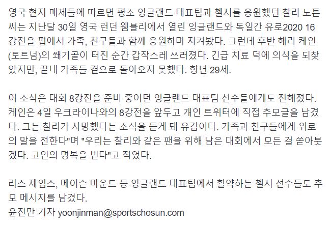 독일전 케인 득점 순간 쓰러진 29세 팬, 끝내 숨져..