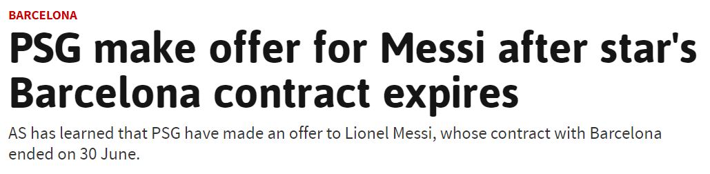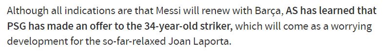 메시가 바르사와 재계약할 것이라는 전망이 나오고 있지만 AS는 PSG가 메시에게 제안을 했다는 것을 알게 되었고, 이 것은 지금까지 맘 놓고 있던 후안 라포르타에게 걱정으로 다가올 것이다.