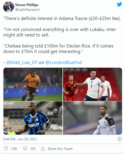 -첼시측은 라이스의 가격을 £100m이라고 전달받음. 만약 £70m정도 까지 내려간다면 상황은 꽤나 흥미롭게 될 수 있음