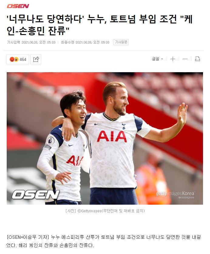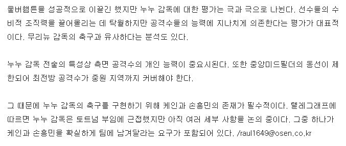 [누누, 토트넘 부임 조건 "케인-손흥민 잔류"]