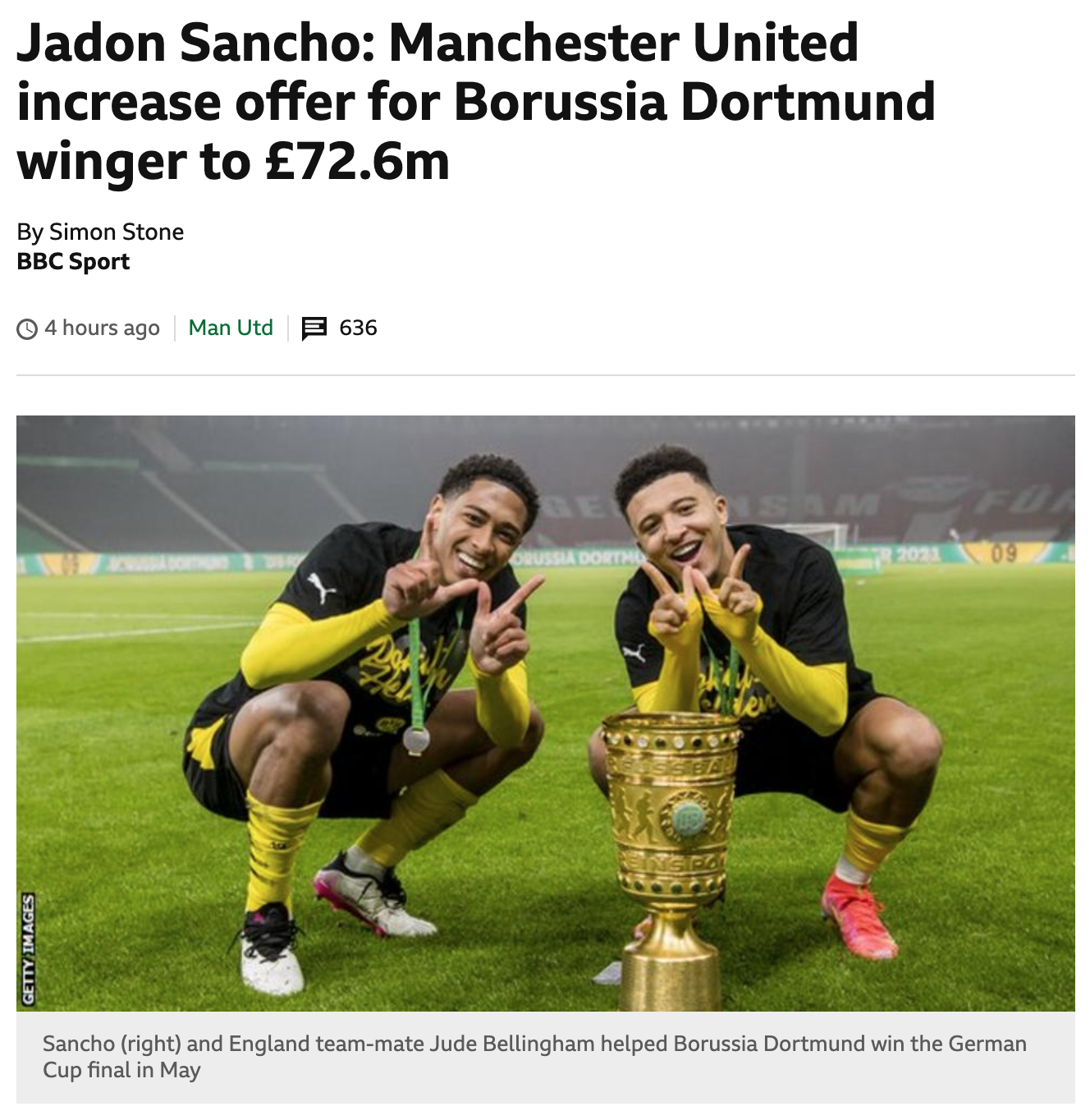 | [BBC] 맨체스터 유나이티드, 제이든 산초 영입 위해 상향 비드 제출 | |