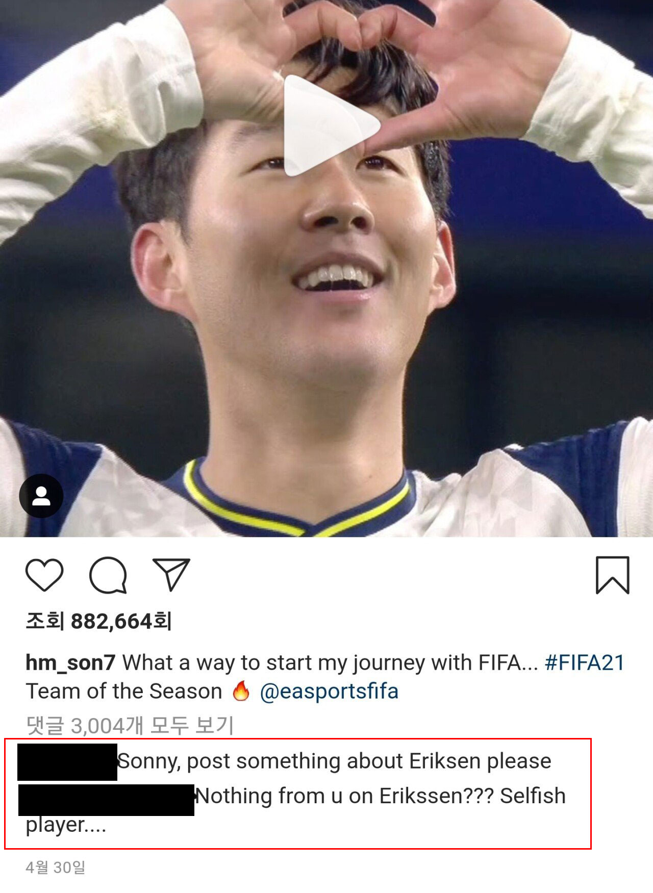 손흥민 인스타 댓글 "손흥민은 에릭센 응원 멘트 안 올림? 이기적인 선수!"