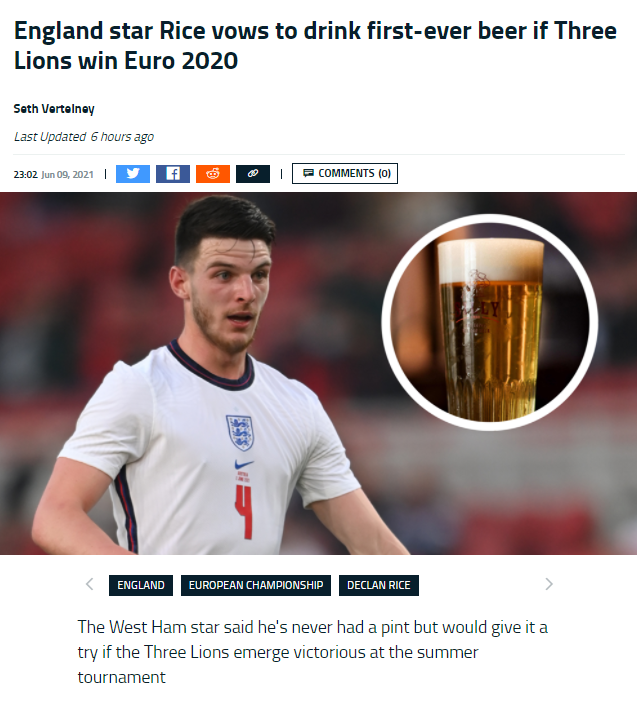 데클런 라이스는 인터뷰에서 지금까지 맥주를 한번도 마셔본적이 없다고 했고 이번 유로에서 잉글랜드가 우승한다면 1파인트정도는 마셔볼 의향은 있다고 했다(1파인트는 약500ml). 하지만 먹자마자 아마 뱉을거라고도 했다.