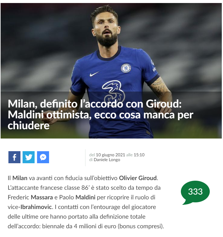 선수의 대리인은 지난 몇시간, 밀란 측과 협상을 가졌고, 연봉 4m유로(보너스 포함)에 2년계약이라는 최종합의에 도달했고 밀란은 지루의 에이전트에게 그들은 오직 FA로만 영입을 원한다고 재차 강조했다고 합니다.