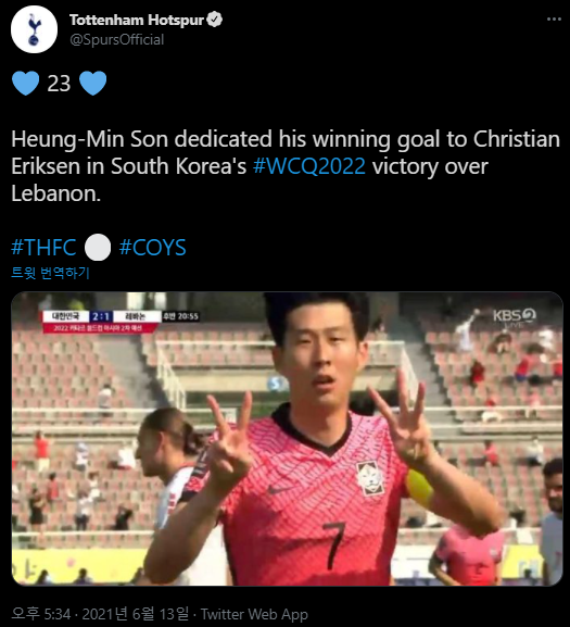 덴마크 언론이 보도한 손흥민의 세레머니. 덴마크 언론사는 손흥민이 에릭센의 등번호를 표시하며 'Chris, I love you'라는 응원 메시지를 보냈다고 보도함. (추가로 아래는 공식 토트넘 인스타)