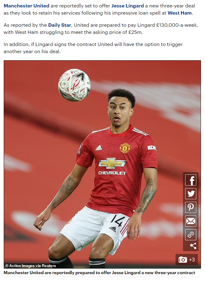 기사 원문 : https://www.dailymail.co.uk/sport/football/article-9729873/Manchester-United-set-offer-Jesse-Lingard-new-130-000-week-three-year-deal.html