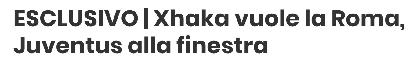 기사에 따르면 유벤투스는 아스널의 중앙 미드필더인 자카를 주시하고 있고 특히 로카텔리의 사수올로와 협상을 끝내는 데 어려움이 계속된다면 자카에 대한 관심을 더 드러낼 것이다. 자카는 로마 사이의 합의가 계속 되고 있다. 그는 로마를 원하지만 영원히 기다릴 수는 없다. 로마의 최근 공식 제안은 1200만 유로와 300만 유로 보너스지만 아스날은 최소 2000만 유로를 원하고있다.