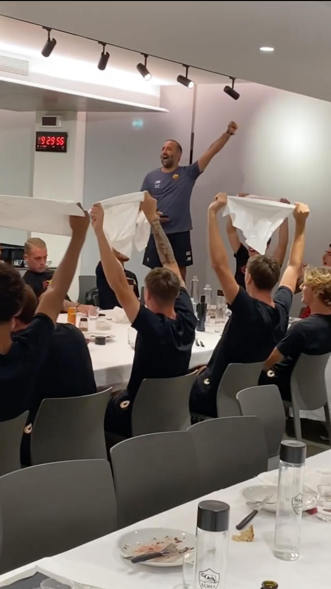 로마 선수단이 저녁 식사를 할 때 클럽의 응원가를 부르게 했다. 무리뉴는 오늘 저녁 자신의 인스타그램 계정을 통해 팀 전체가 클럽 응원가인 Roma, Roma, Roma를 부르는 영상을 게시했다.