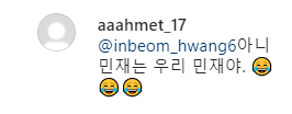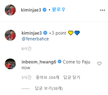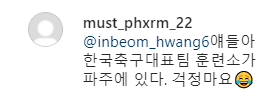 김민재 선수의 오늘자 게시물에 파주(국가대표소집센터)로 오라는 댓글을 단 황인범