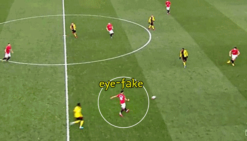 [브루노 페르난데스의 훼이크(fake)활용법.gif] 후방 빌드업 과정.. (1)패스 하기전 동료 위치 확인하고 (2)그리고 아이-페이크 2번, 모션-페이크 1번