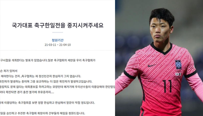 청와대 국민청원에 올라온 '3월 한일전 축구 취소'