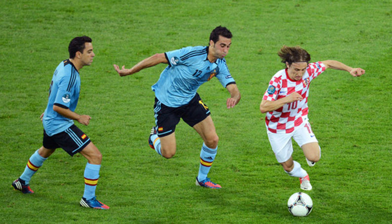 [스페인 세얼간이와 맞짱 뜨는 모드리치.gif] 유로2012에서 최전성기 세얼간이(사비, 이니에스타, 부스케츠)+실바를 상대하는 모드리치 ㄷㄷㄷ