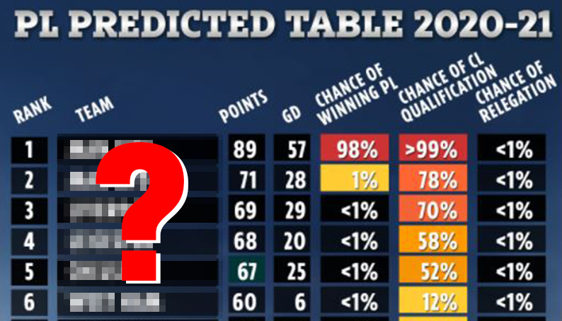 [슈퍼컴퓨터가 예측한 이번 시즌 최종 PL 테이블] (기사 전문: https://www.thesun.co.uk/sport/football/14052450/premier-league-predicted-table-supercomputer/ ) 1위 - 맨시티 2위 - 맨유 3위 - 리버풀 4위 - 레승터 5위 - 첼시 6위 - 웨스트햄 7위 - 토트넘 8위 - 아스톤빌라 9위 - 아스날 10위 - 에버턴 ...