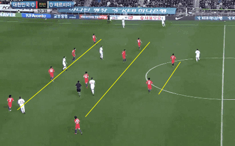 일사불란하게 움직이는 축구의 수비 라인.gif