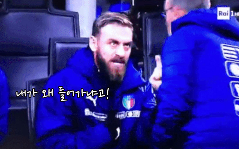 [감독의 교체에 불만을 가졌던 데 로시.gif] 이탈리아가 경기를 이겨야 2018 러시아 월드컵에 진출이 가능한 상황 (비겨도 월드컵 진출 실패). 경기는 막판을 향해가고 점수는 비기고 있는 상황에서 감독은 수비적인 데 로시를 투입하려했다. 데 로시는 이에 불만을 가짐. De Rossi when asked to warm up: "Why the **** should I come on? We're not meant to draw, we're meant to win!" Then points to Insigne ("ㅅㅂ 왜 내가 나가야 하는데? 우리 비기려는 거 아니잖아, (인시녜 가리키며) 우린 이겨야 한다고!") 경기를 이기려면 수비적인 자신이 아닌 공격적인 인시녜를 투입하라고 했던 데 로시. 자신보단 팀의 승리가 우선이었던 프로ㄷㄷ (결국 이탈리아는 2018 러시아 월드컵 진출 실패)