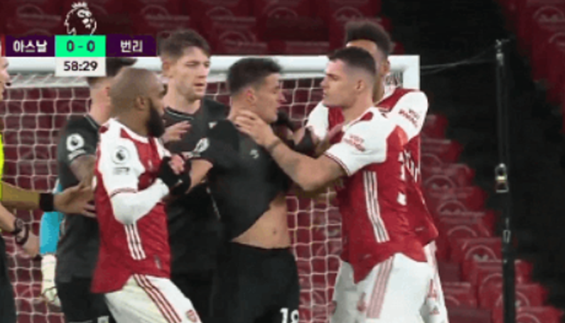 [불필요한 몸싸움으로 결국 게임 터트리는 자카.gif] 발단은 맥닐에게 한 위험한 태클 그리고 둘이 싸우면서 한바탕 난리남 주심은 처음에 쟈카에게 경고줌 근데 VAR로 쟈카가 상황말리는 웨스트우드 쵸크하는게 잡힘 결국 VAR 후 퇴장으로 변경 아이고.... 이런 불필요한 도발에 넘어가버리네......... 출처 : 뉴락싸_Sky Sports News