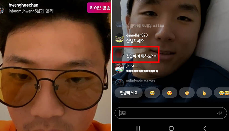 [황희찬 인스타 라이브 중 '진민짜이' 드립에 빡친 김민재] 황희찬의 인스타 라이브 도중 한 팬의 진민짜이 드립 '진민짜이' 드립에 빡친 김민재ㅠㅠ 어휴..... 왜 자꾸 선을 넘냐..... 출처 : 스포탈코리아