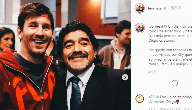 메시 : 모든 아르헨티나와 축구인들에게 매우 슬픈 날입니다. 그는 우리를 떠나지만 디에고는 영원하기 때문에 떠나지 않습니다.
