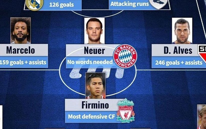 [축구계 '세계관 최강자' 베스트 11] 라모스: 126골 기록 루시우: 중앙 수비수지만 공격 가담과 스피드로 유명 마르셀로: 공격포인트 159개 알베스: 공격포인트 246개 노이어: “설명이 필요 없다” 움티티: 움티티 수아레스: 가나전 ‘신의 손’ 케파: 감독 출처 : 에펨코리아