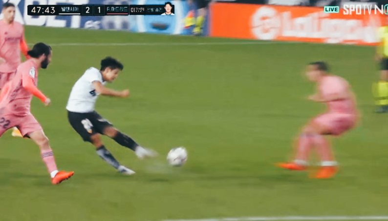 오늘자 이강인 탈압박 후 미친 중거리 골대샷..ㄷㄷ.gif