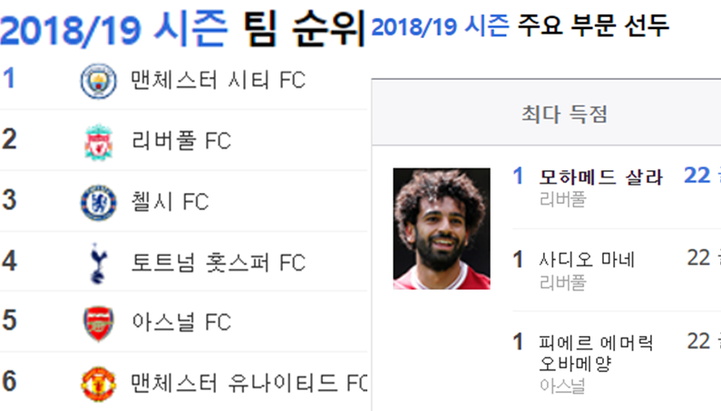 ['3년전과 데자뷰?' 3년전과 같은 흐름이 이어지고 있는 EPL] 18/19시즌 리그 최종 순위 그리고 거의 마지막 경기들만 남겨둔 이번 시즌 순위 18/19 시즌의 득점왕은 22골로 모하메드 살라 그리고 이번시즌도 22골로 살라가 득점 선두ㄷㄷㄷㄷㄷ 이거 완전 데자뷰네ㅋㅋㅋㅋㅋㅋㅋㅋㅋ