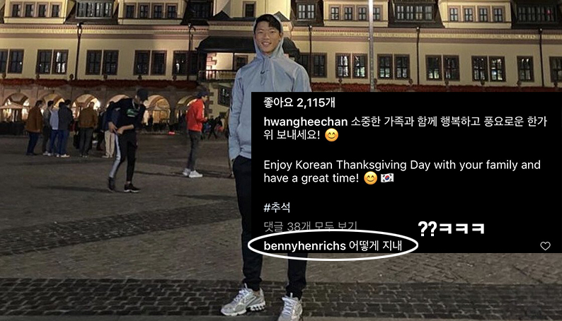 [라이프치히에서도 한국말 전파하는 황희찬ㅋㅋㅋ] 인스타에 추석 맞이 게시글을 올린 황희찬, 그런데 댓글에 "어떻게 지내"라고 한국말로 인사하는 핸리치ㅋㅋㅋ 그와중에 왜 둘이 닮은 것 같냐ㅋㅋㅋ 그냥 노란머리 황희찬이네ㅋㅋㅋ 출처: 에펨코리아