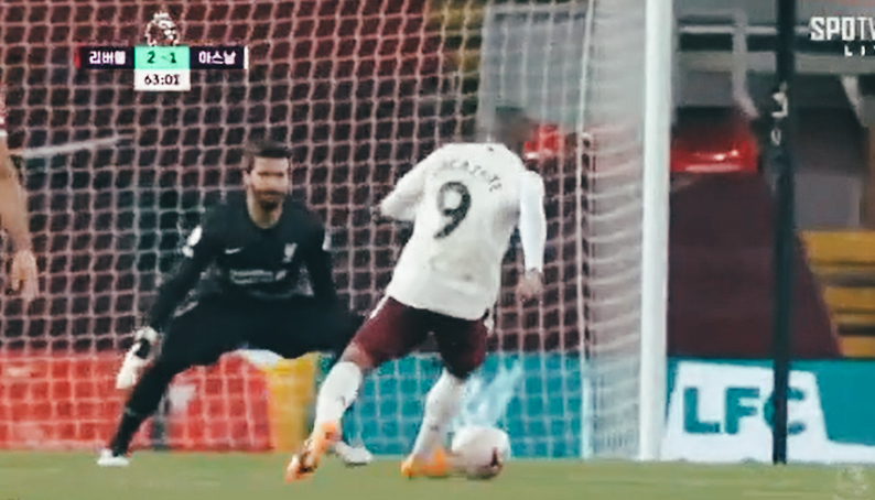 아스날의 결정적 기회를 막는 알리송, 좌설하는 라카제트.gif