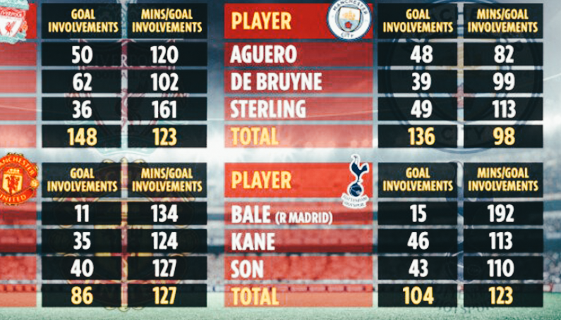 [더 선] 지난 2시즌간 BIG6 트리오 비교 ㅇ공격 포인트 많은 팀ㅇ 리버풀-맨시티-아스날=첼시-토트넘-맨유 ㅇ분당 공격 포인트 좋은 팀ㅇ 맨시티-첼시-토트넘=리버풀-맨유-아스날 ㅇ순위에 포함된 미드필더ㅇ 덕배 , 하베르츠 ㅇ최고 효율적인 선수ㅇ 아구에로 : 82분당 1공포 (토탈 48공포) (이어서, 베르너 93분-덕배 99분-살라102분-손흥민 110분) ㅇ최고 많은 공포를 기록한 선수ㅇ 살라 : 62개의 공포 (이어서, 베르너 59개-오바메양 54개-마네 50개-스털링 49개-아구에로 48개) https://www.thesun.co.uk/sport/football/12745703/premier-league-best-front-three-tottenham/ 출처 : 에펨코리아_연간보고서