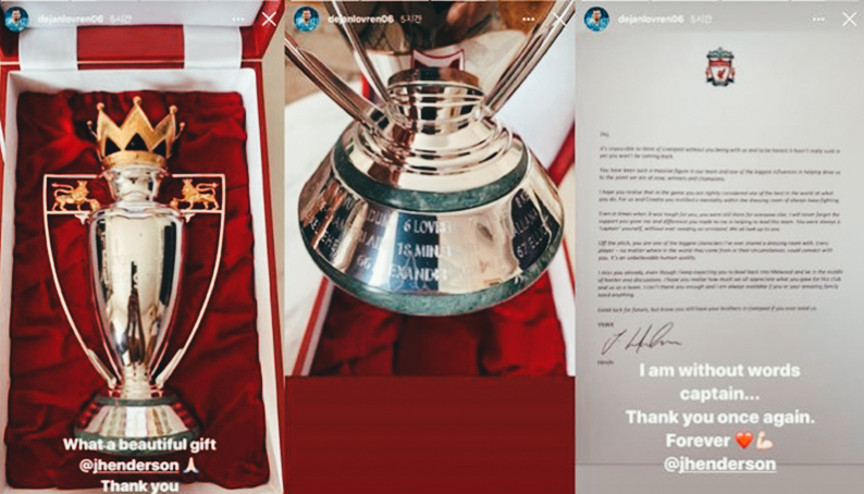 [헨더슨, 리버풀 떠난 로브렌에 감동 선물, 편지] 로브렌은 지난 두 시즌 동안 리버풀에서 뛰며 챔피언스리그를 제패하고 프리미어리그 우승컵을 들어올리는데 힘을 보탰다. 하지만 지난 7월 리버풀을 떠나 제니트(러시아)로 이적했다. 헨더슨은 지난 2014년부터 리버풀에서 함께 뛰었던 로브렌에게 리그 우승 트로피 복제품과 함께 진심이 담긴 이별 편지를 썼다. 그동안 리버풀을 위해 헌신한 고마움을 표시한 것이다. 헨더슨은 편지에서 데얀에게 "당신 없는 리버풀을 생각하기 힘들다"면서 "당신은 우리 팀에 엄청난 사람이었고 리그 우승과 챔피언스리그를 제패할 수 있도록 지금의 우리가 있기까지 가장 큰 영향을 끼쳤다. 당신이 한 일은 세계 최고 중 하나로 여겨지고 있다는 것을 알아줬으면 한다"라고 고마움을 전했다. "탈의실에서 우리와 크로아티아를 위해 정신적으로 '항상 계속 싸워라'는 정신력을 불어넣었다. 당신이 힘들 때조차 당신은 계속 다른 모든 사람들을 위해 그래줬다" "당신이 내게 보내준 지지와 이 팀을 이끌기 위해 나를 도와준 차이를 절대 잊지 않을 것" "당신은 항상 완장이 필요없는 '주장'이었다. 우리는 모두 당신을 존경했다. 당신은 경기장 밖에서도 내가 탈의실에서 같이 한 최고의 사람 중 한 명이다" "전 세계 어떤 환경의 누가 오더라도 모두 교감할 수 있는 사람이 당신" "당신이 하나의 팀으로서 우리와 이 클럽을 위해 준 것에 대해 얼마나 감사하고 있는지 알아줬으면 한다" "감사의 말을 다 전할 수 없지만 당신과 당신의 환상적인 가족들에게 필요한 것이 있으면 언제든 연락을 달라. 미래에 행운이 따르길 바라지만 우리가 필요하다면 리버풀에 아직 형제가 있다는 것을 알아달라" 'OSEN' 기사: https://sports.news.naver.com/news.nhn?oid=109&aid=0004270907