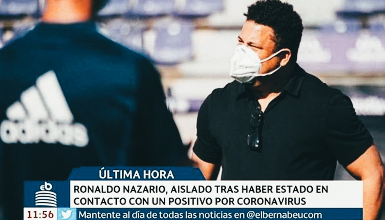[호나우두, 코로나 양성반응으로 격리조치] (트위터: https://twitter.com/elbernabeucom/status/1297110307790360576?s=19 ) "Ronaldo Nazario, aislado tras haber estado en contacto con un positivo por coronavirus" -> 구글 번역: "코로나 바이러스 양성 반응 후 분리 된 호나우두 나자리오"