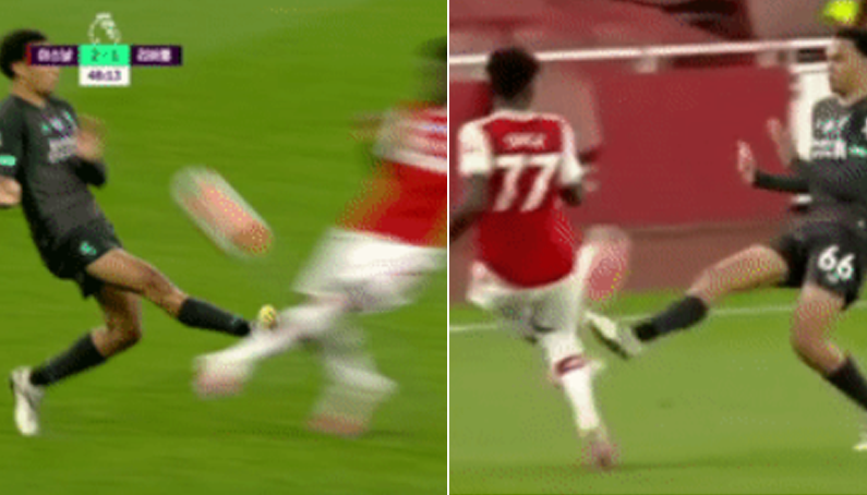 [현재 굉장히 논란중인 아놀드의 발바닥으로 들어가는 태클.gif] 오늘 경기 아놀드의 위험한 태클 현지에서도 은케티아가 퇴장당했던 태클이랑 뭐가 다르냐고 VAR도 안보냐고 논란중 출처 : 에펨코리아_WIFDGNI
