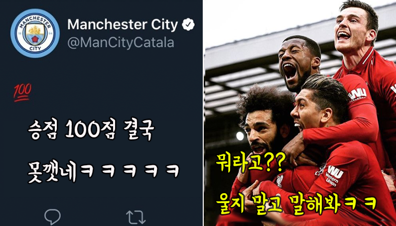 [맨체스터 시티 공식 트윗 근황ㅋㅋㅋㅋㅋ] 리버풀이 승점 100점 기록을 깨지 못한 것을 놀리는 맨시티의 공식 트윗 시티 챔스 0회라고 참교육 들어가는 리버풀팬 글삭튀 하는 맨시티 ㅋㅋㅋㅋㅋㅋㅋㅋㅋㅋㅋㅋㅋ 출처 : 뉴락싸_마카롱