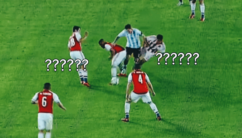 [미친 바디 밸런스로 다 튕겨내는 메시.gif] 양쪽에서 동시에 달려드는 파라과이 선수들을 버텨내는 메시. 드리블로 뚫어낸 후 디마리아에게 연결 -> 디마리아가 PK 얻어내며 메시의 PK 득점. 경기는 2015 코파 아메리카 조별리그. 출처 - 아이라이크사커(모챙티비 님)