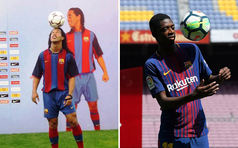 [뭔가 차이나는 바르셀로나 입단식 장면.gif] 공이 몸에 붙은 것 같은 호나우지뉴의 스킬 어딘가 어설픈 뎀벨레의 입단식ㅋㅋㅋㅋㅋ