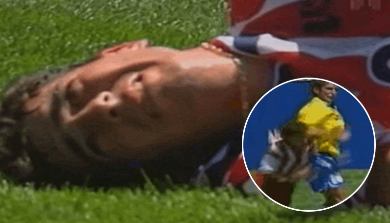 [월드컵 경기중 '엘보우에 광대뼈가 함몰된 사건'.gif] 94월드컵 16강 홈팀 미국과 우승후보 브라질의 전반전 레오나르두의 팔꿈치 어택 미국선수는 광대뼈 함몰로 월드컵 아웃. 레오나르두도 퇴장 후 5경기 징계로 역시 월드컵 아웃. 출처 : 뉴아이라이크사커_현승회.