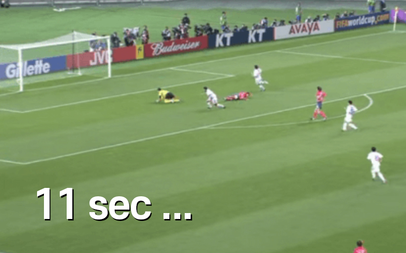 [월드컵 역대 최단시간 골.gif] 2002년 월드컵 VS 터키 (3/4위전) 킥오프하고 볼 끌다 광속 실점 경기 시작 11초만에 먹힌 골.. 월드컵 최단 기록.. 홍명보의 실수로 만들어진 상황이었지만 당시 홍명보는 엄청난 사랑과 존경을 받던 선수였고, 당시 월드컵 끝물 3/4위전이라 별 말 없이 넘어갔던.. 출처: 에펨코리아