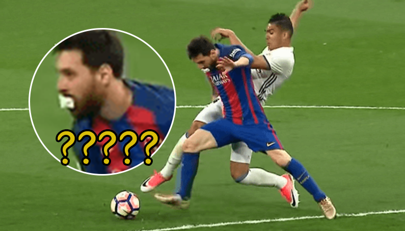 [아이템 장착하고 피지컬 싸움 붙는 메시.gif] 피가 안 멈춰서 입에 거즈 물고 몸싸움함 카세미루에게 몸싸움을 이겨내고 전진함 ㄷㄷㄷ 출처 : 뉴아이라이크사커_라시현