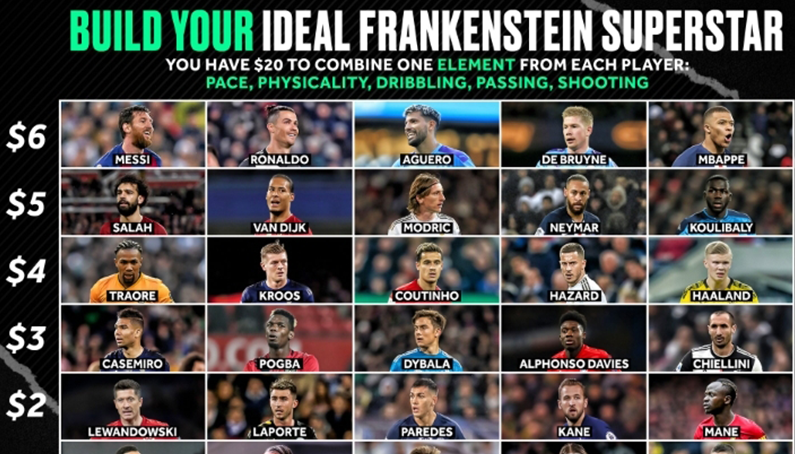 [B/R Football] $20으로 선수 만들기 $20 to spend. One attribute from each player. Pace, Physicality, Dribbling, Passing, Shooting. Who you picking? $20 사용. 각각의 선수로부터 하나의 특성 가져올 수 있음. 속력, 피지컬, 드리블, 패스, 슛팅 저같으면.. 속력 : 음바페 $6 피지컬 : 라모스 $1 드리블 : 메시 $6 패스 : 모드리치 $5 슛팅 : 레반도프스키 $2 이렇게 만듭니다 ㅋㅋㅋ 출처 : 아이라이크사커_정예린