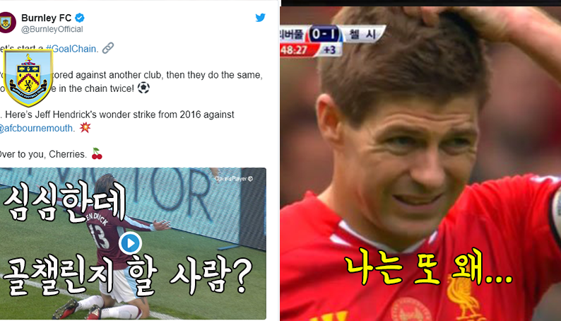 [EPL 중단으로 트위터에서 일어난 골챌린지 대소동ㅋㅋㅋ] 번리관리자가 심심했는지 EPL 골챌린지 선언함 번리는 본머스상대로 골 넣은영상을 올림 *다른팀상대로 넣은 골 영상하나를 올리는거 중복불가 본머스는 맨시티 상대로 골 넣은영상을 올림 이에 맨시티는 아스날상대로 넣은 덕배의 중거리슛골을 올림 아스날은 라이벌팀 토트넘상대로 넣은골을 올림 갑분싸만드는 토트넘의 고전짤 골이올라옴 상대는 리버풀 문제의시작 ㅋㅋ 리버풀은 규직준수하며 첼시상대로 멋진 골을 넣은 살라영상을 올림 이에 빡친 첼시는 브레이커선언하며 제라드짤을 올림ㅋㅋㅋㅋㅋ 이에 반칙선언하는 번리 하지만 무시해버리는 첼시 ㅋㅋㅋㅋㅋ 조회수는 압도적으로 그 영상 ㅋㅋㅋㅋㅋㅋㅋ 출처 : 에펨코리아