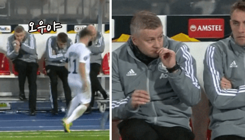 벤치로 날아온 볼에 깜짝놀란 솔샤르ㅋㅋㅋㅋㅋ.gif