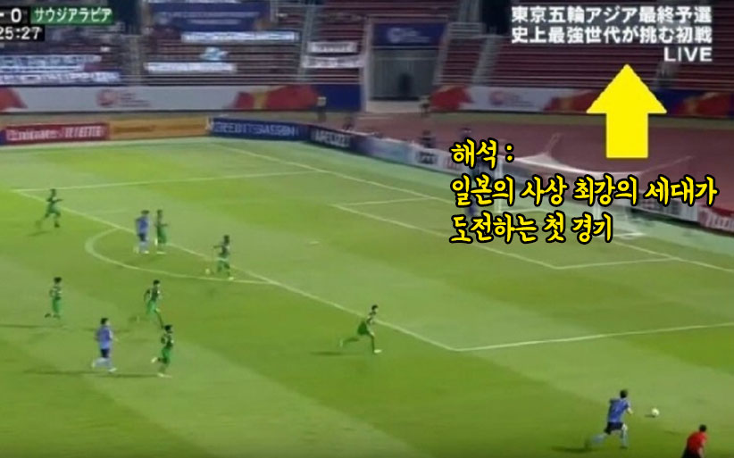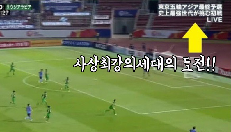 [일본 특유의 설레발로 보는 사상최강의세대ㄷㄷㄷㄷ] 도쿄올림픽 아시아 최종예선 사상최강세대가 도전, 첫 경기라고 적혀있는 자막 사우디 선제골 사상최강의세대 자막 사라짐 일본 동점골 사상최강의세대 자막 부활 사우디 역전 결승골 사상최강의세대 자막 다시 사망.. 일본의 사상최강의세대는 이기고 있을 때만 볼 수 있다고 한다.....ㅋㅋㅋㅋㅋㅋㅋㅋㅋㅋㅋㅋㅋㅋㅋㅋ 출처 : 아이라이크사커