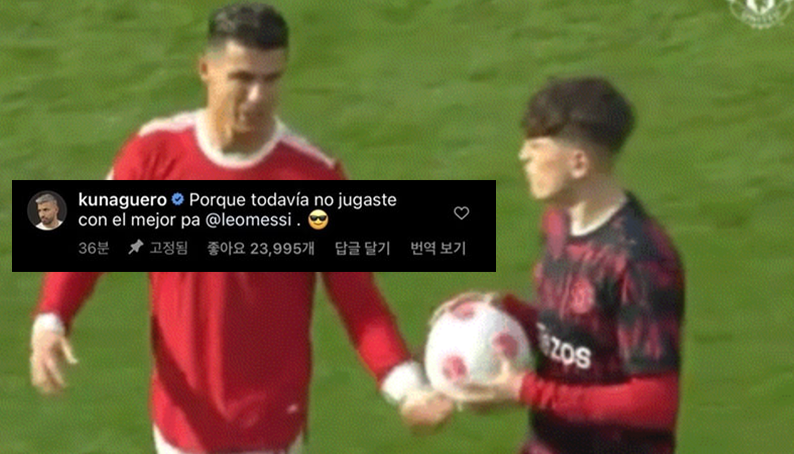 ['역시 스트리머?', 현재 난리난 맨유 유스 인스타에 달린 아게로의 댓글] 경기 종료 후 헤트트릭 한 매치볼을 유스 선수인 가르나초(아르헨티나 국적)에게 선물하는 호날두 매치볼을 받고 신난 가르나초는 본인 인스타에 '역대 최고의 선수 호날두'라고 매치볼은 받은 장면을 올렸고 그 대댓글에 아게로가 “넌 아직 최고랑 뛰어보지 못했기 때문이야 @메시” 라고 메시를 태그하며 대댓글을 달아 현재 댓글창 메호대전으로 난리남ㅋㅋㅋㅋㅋ