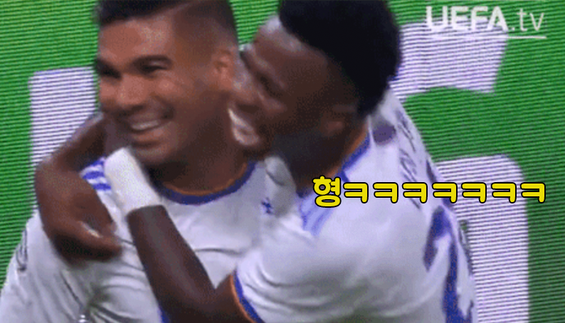 ['레알 마드리드 대선배' 카세미루 물먹이는 비니시우스] 엉덩이 부딪히는 세레모니 하려했는데 비니시우스가 하이파이브로 응답해서 뒤로 굴러떨어지는 카세미루 ㅋㅋㅋㅋㅋㅋ