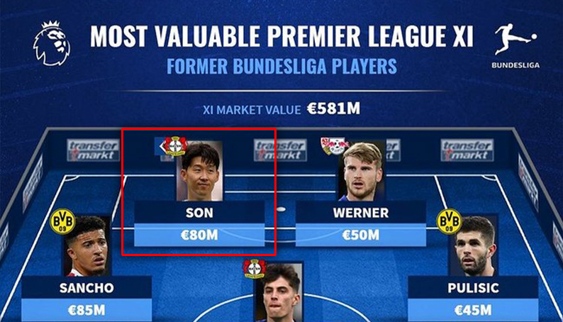 [<분데스 출신 EPL 스타 베스트 11>에 '몸값 3위' 등극한 손흥민] (트랜스퍼마크트) 1. 케빈 더 브라위너 9000만 유로(약 1204억 원) 2. 제이든 산초 8500만 유로(약 1137억 원) 3. 손흥민 8000만 유로(약 1070억 원) 4. 카이 하베르츠 7000만 유로(약 936억 원) 5. 티모 베르너 5000만 유로(약 669억 원) 6. 크리스티안 풀리시치, 찰라르 쇠윈쥐 4500만 유로(약 602억 원) 7. 안토니오 뤼디거, 일카이 귄도안 8. 이브라히마 코나테 9. 베른트 레노