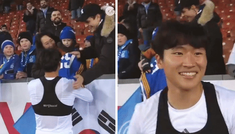 [너무 훈훈한 정상빈의 팬 서비스.gif] 경기가 종료된 후에 자신의 첫 경기 유니폼임에도 팬 서비스를 하네요ㄷㄷㄷ 출처 : 사커라인_tora002